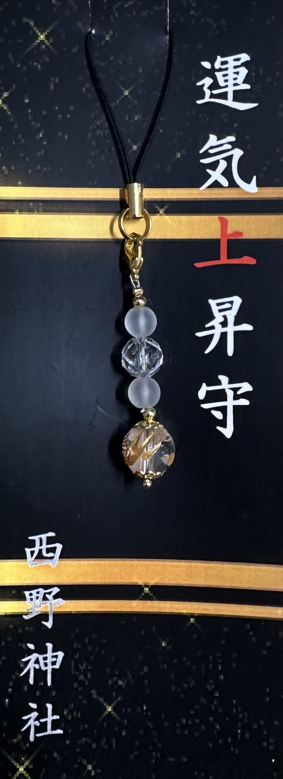 本水晶に金色昇り龍の絵柄が入っており、ご神前にて運気上昇の御祈願を行っております。